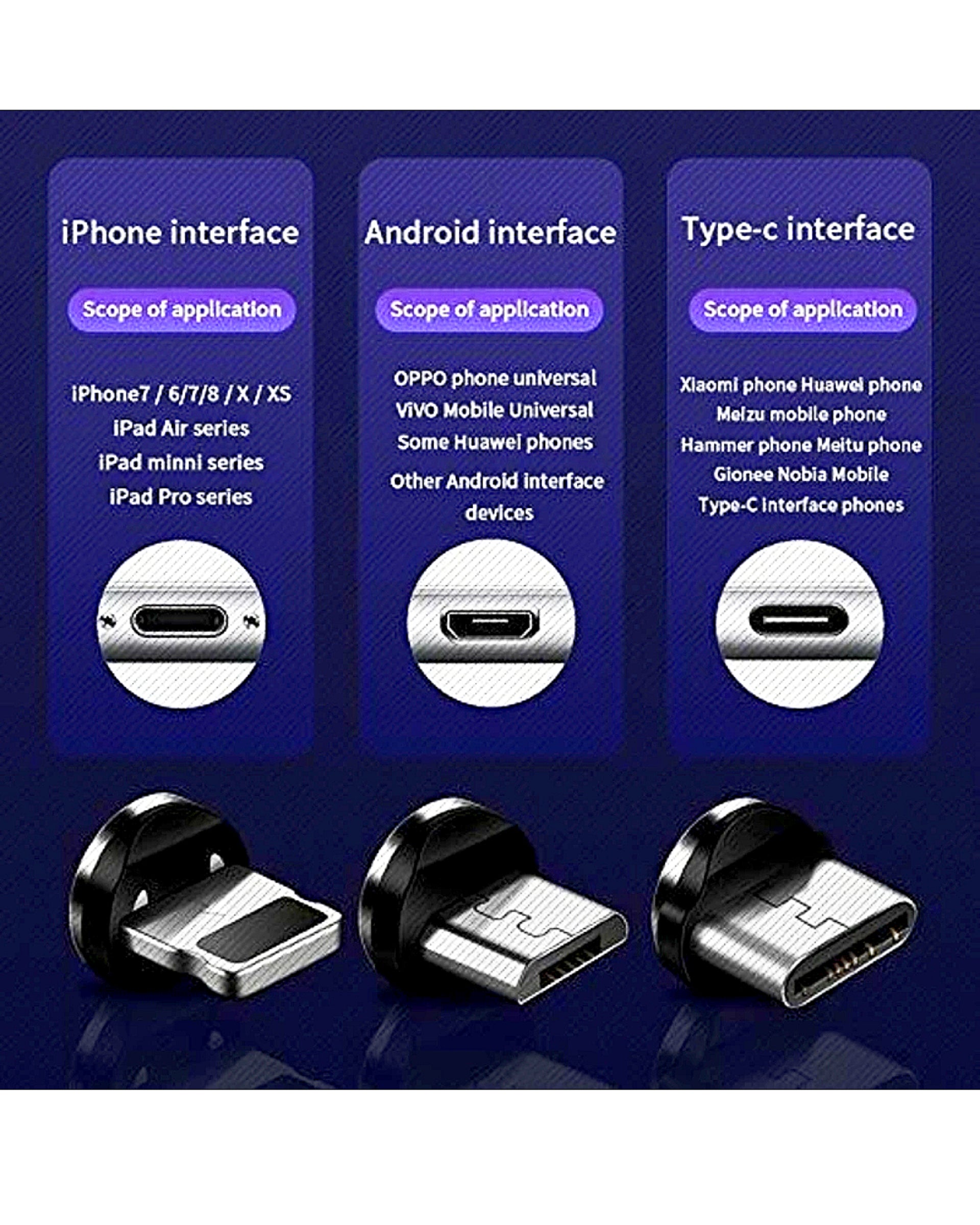 It comes with 3 interchangeable magnetic heads – Type-C, Micro USB, and Lightning – making it compatible with almost all smartphones and devices. With fast 3A charging, durable braided design, and 360° rotating magnetic joint, this cable is perfect for safe, convenient, and tangle-free charging.