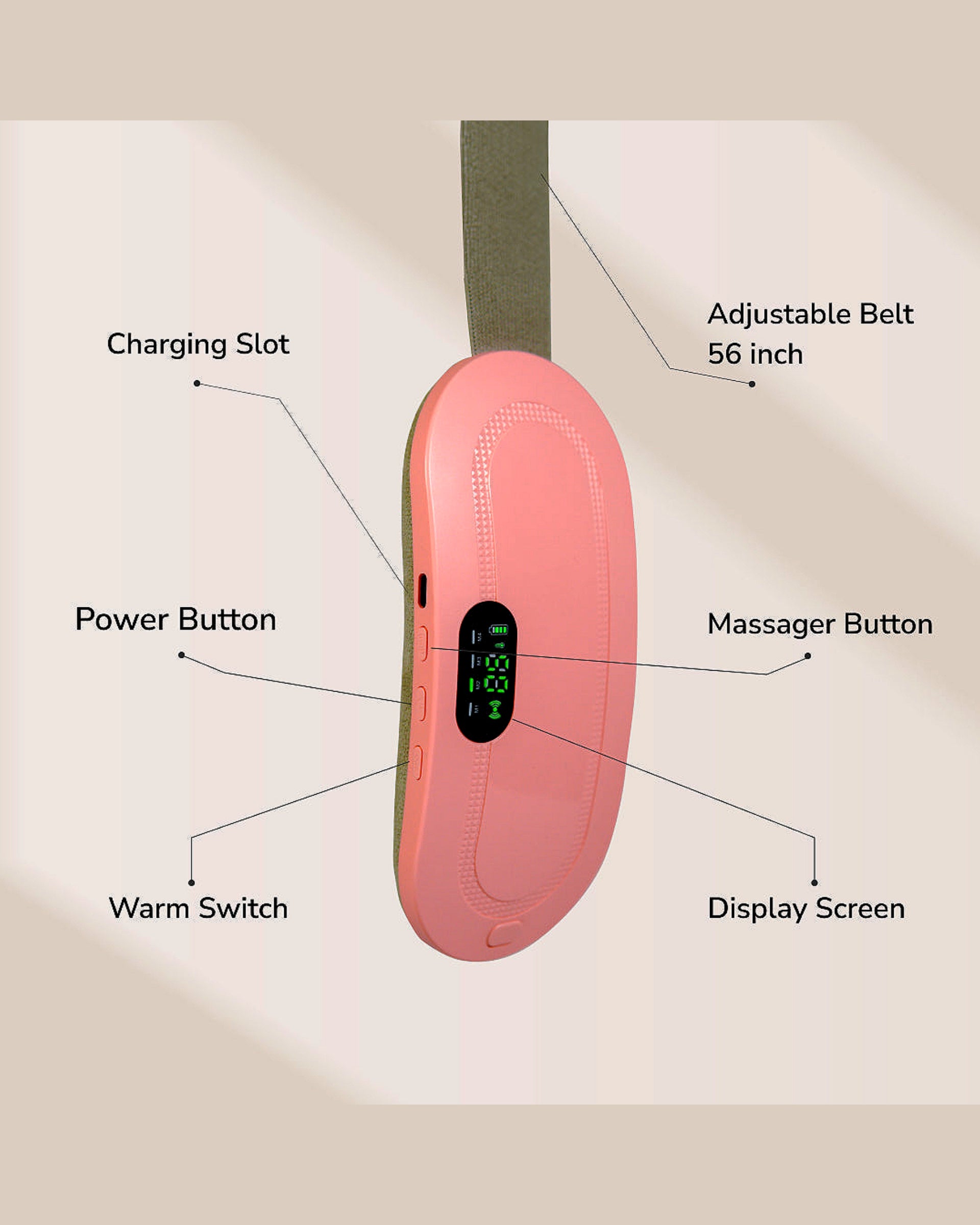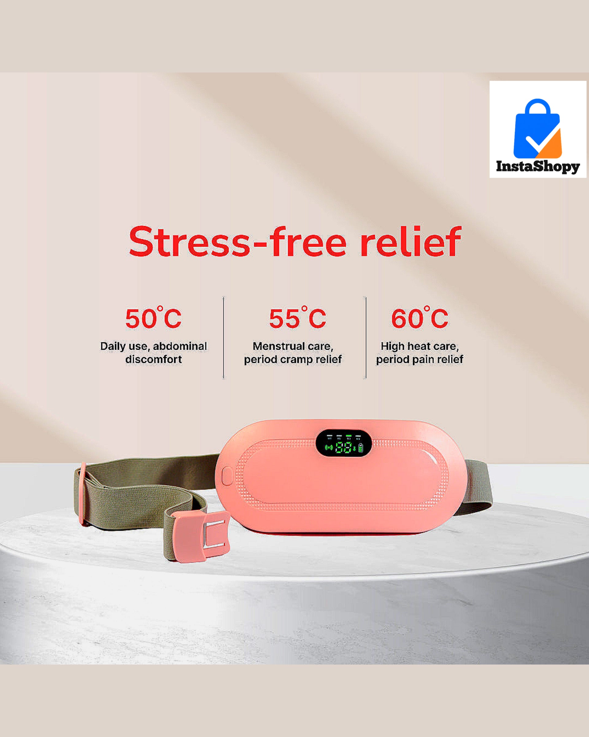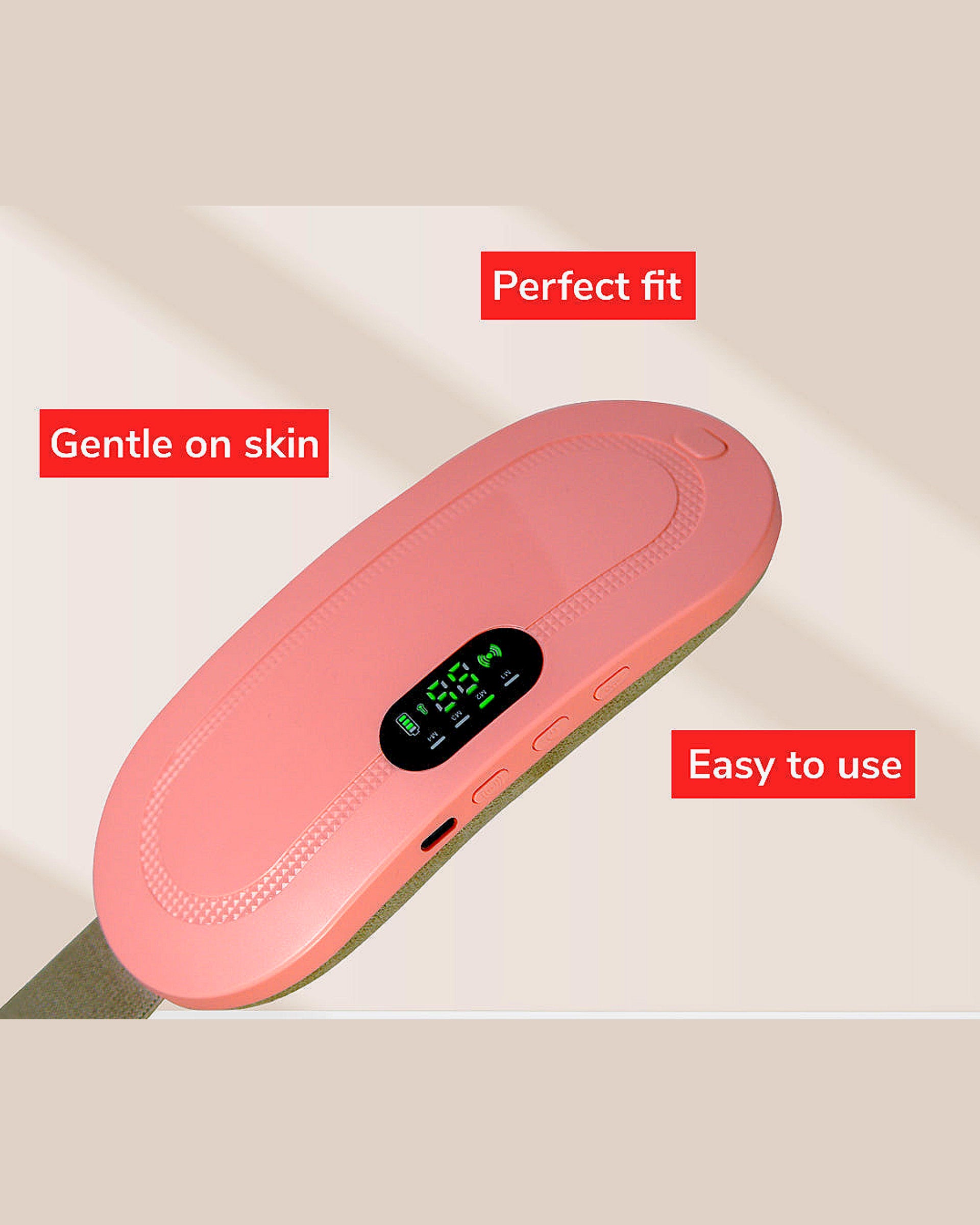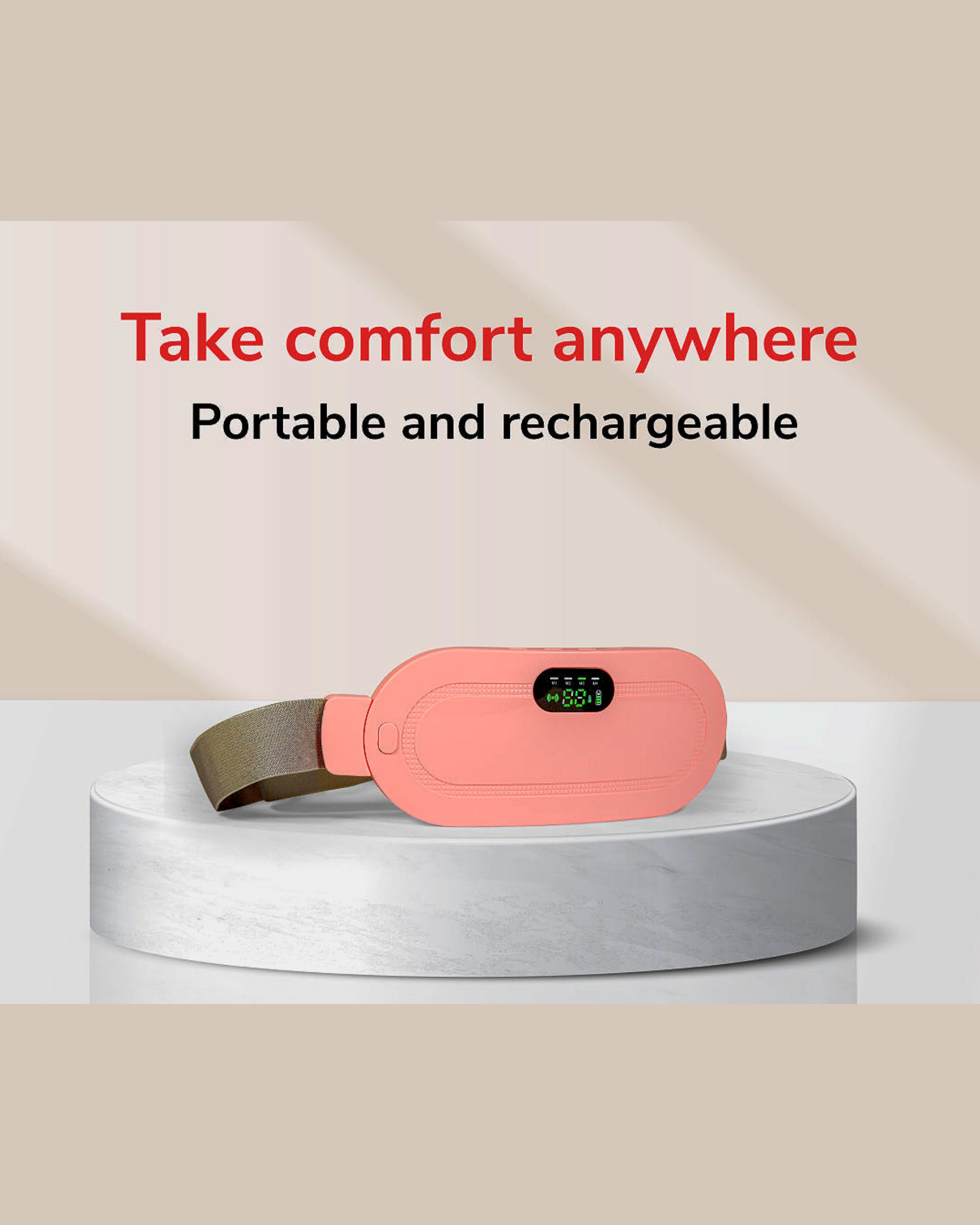 Say goodbye to discomfort during your periods with this rechargeable heating pad belt with massage function. Designed to provide instant relief from menstrual cramps, abdominal pain, and muscle tension, it combines 3 heat modes and 4 massage modes for customized comfort. Its lightweight, adjustable design makes it easy to wear at home, work, or while traveling. With a built-in rechargeable battery, you can enjoy cordless relaxation anytime, anywhere.