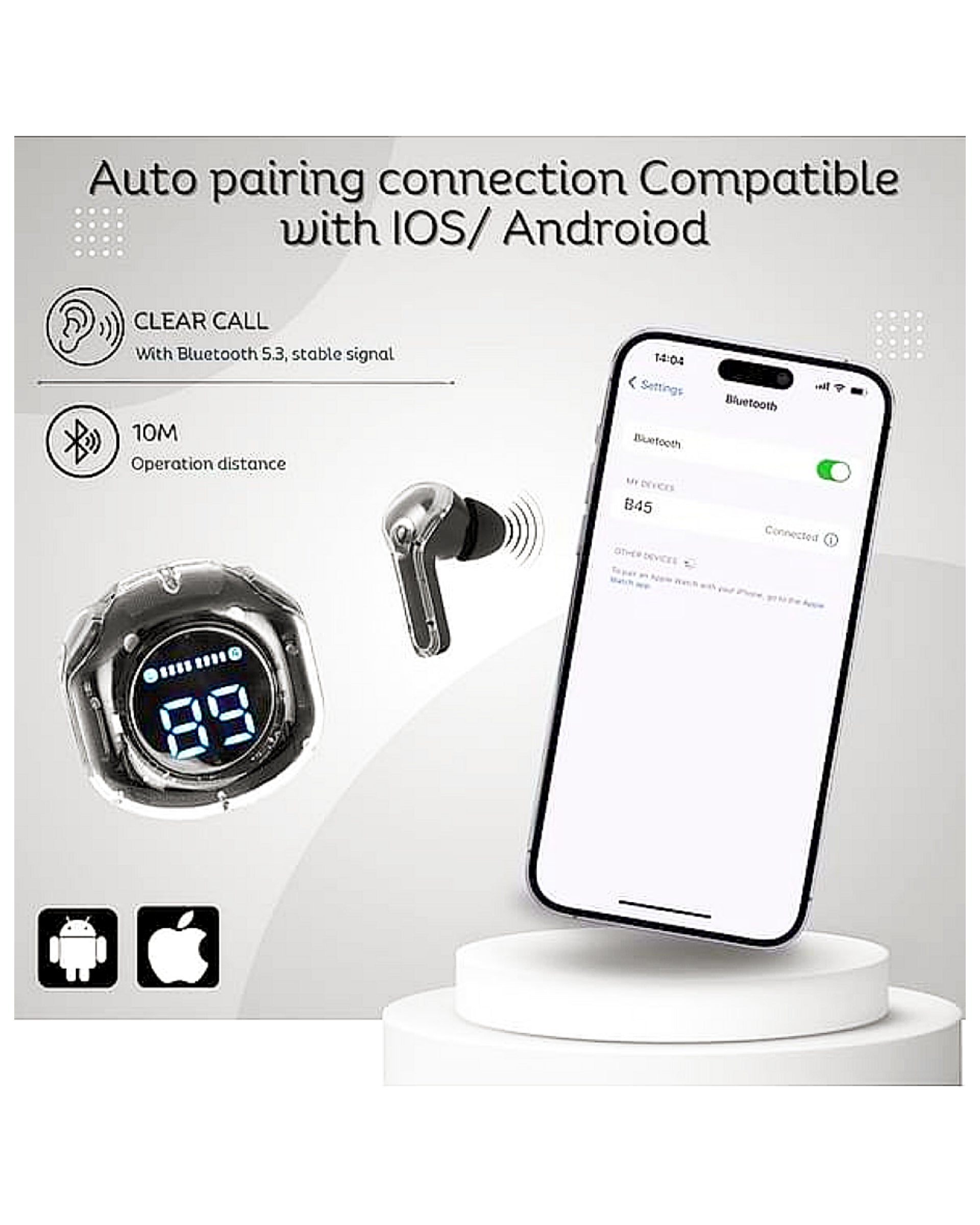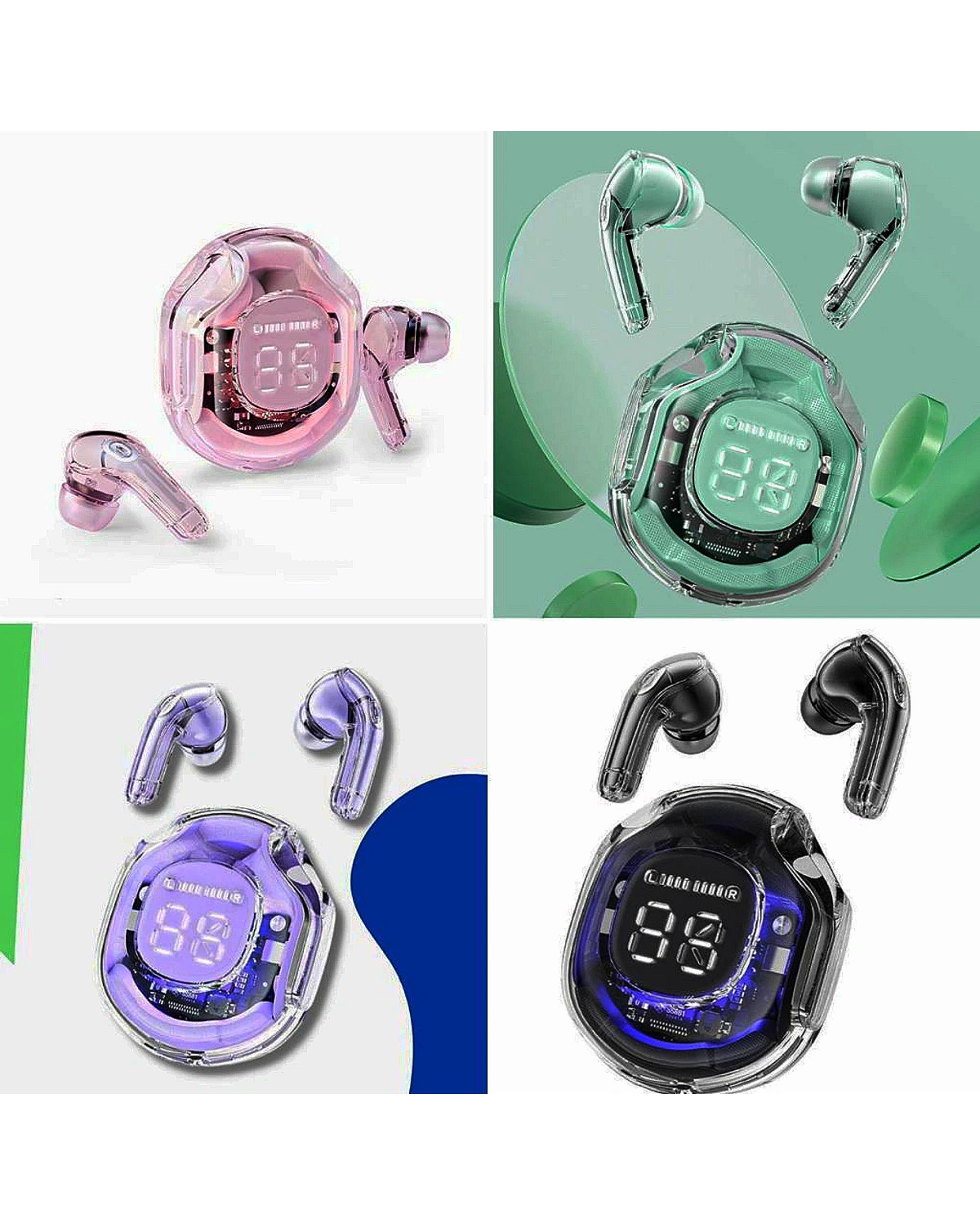 Upgrade your audio experience with these stylish TWS Transparent Wireless Earbuds, designed for premium sound and modern aesthetics. The unique transparent design gives a futuristic look, while the LED digital display charging case keeps you informed about battery levels at a glance.
